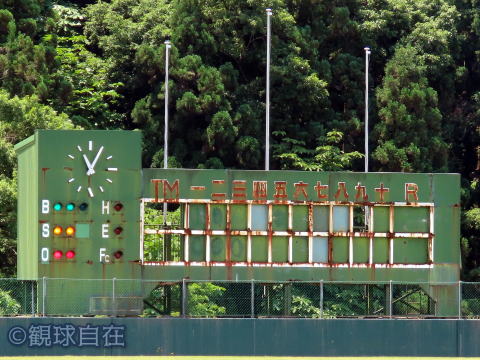 山の上の小高い丘にある。 照明塔。 外観。 スコアボードはカウントのみの使用だった。