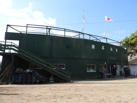 諌早駅から徒歩10分程度、駅から近いのもまた古い球場らしい。深緑の外観が特徴的。観客席に椅子は全く無く