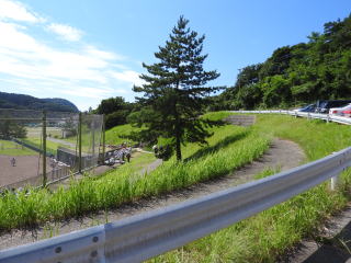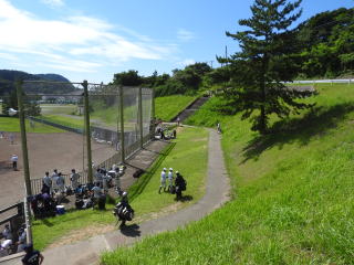 | 座席は一切無い。ネット裏の一本松の下が唯一の木陰。 | ネット裏の土手上に椅子を置いて観ることも可能。 |