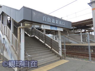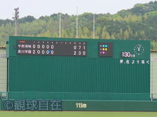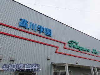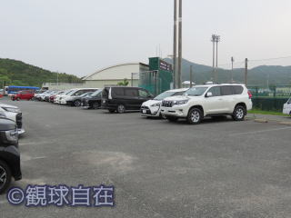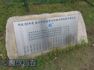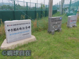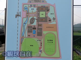 ネット裏メインスタンドは屋根付き。 学園内案内図。 記念碑いろいろ。 球速表示にも対応。 山陽本線・大道(だいどう)駅の南口を出てすぐという立地。 駐車場。